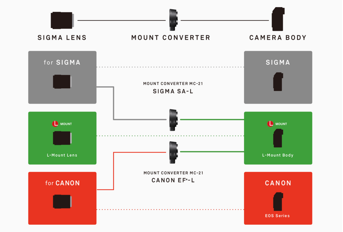 - Der Sigma MC-21 kann nicht mit Leica-Kameras (Leica T, TL, TL2, CL, SL) verwendet werden, die vor der Ankündigung der L-Mount Alliance auf den Markt gekommen sind.