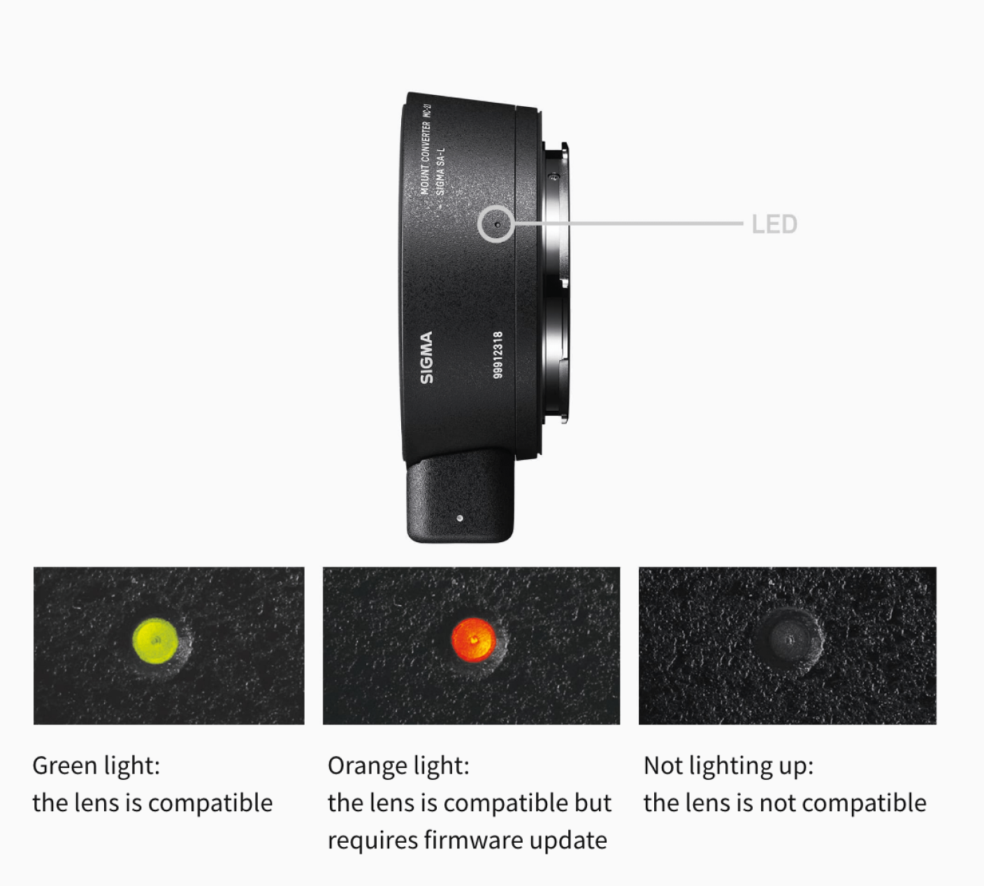 Ob das montierte Objektiv kompatibel ist oder nicht, lässt sich sofort an der Farbe und dem Ein-/Aus-Status der integrierten LED des MC-21 erkennen. Die LED benachrichtigt den Benutzer auch, wenn eine Firmware-Updates für das Objektiv verfügbar ist.