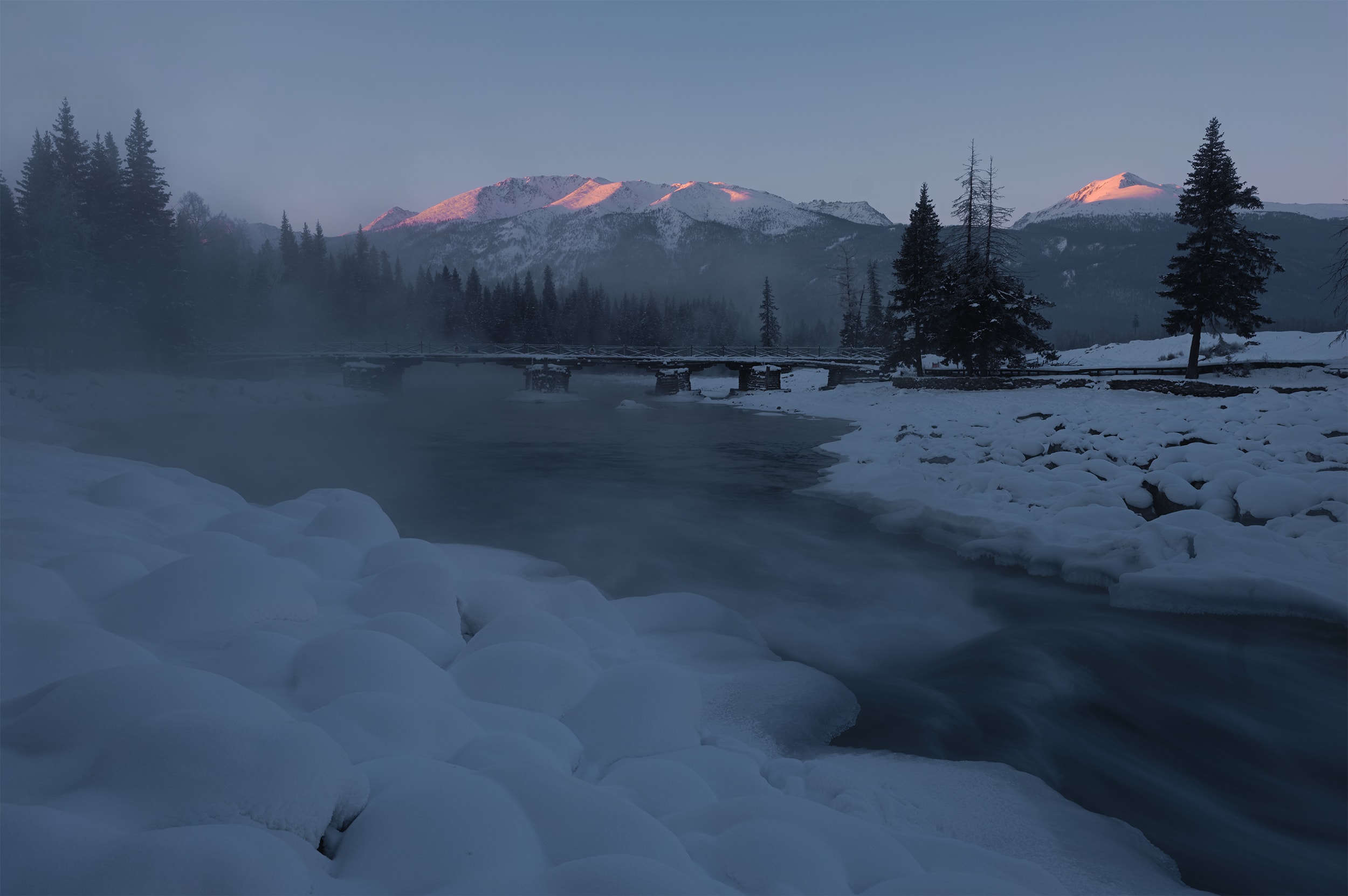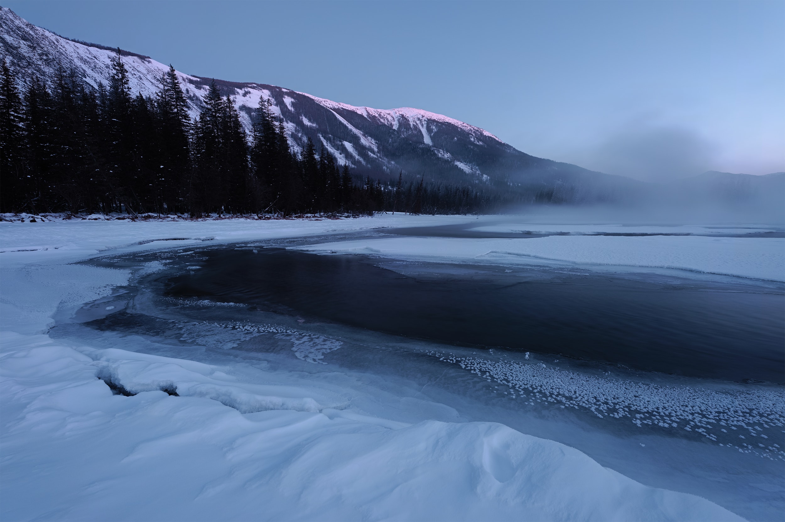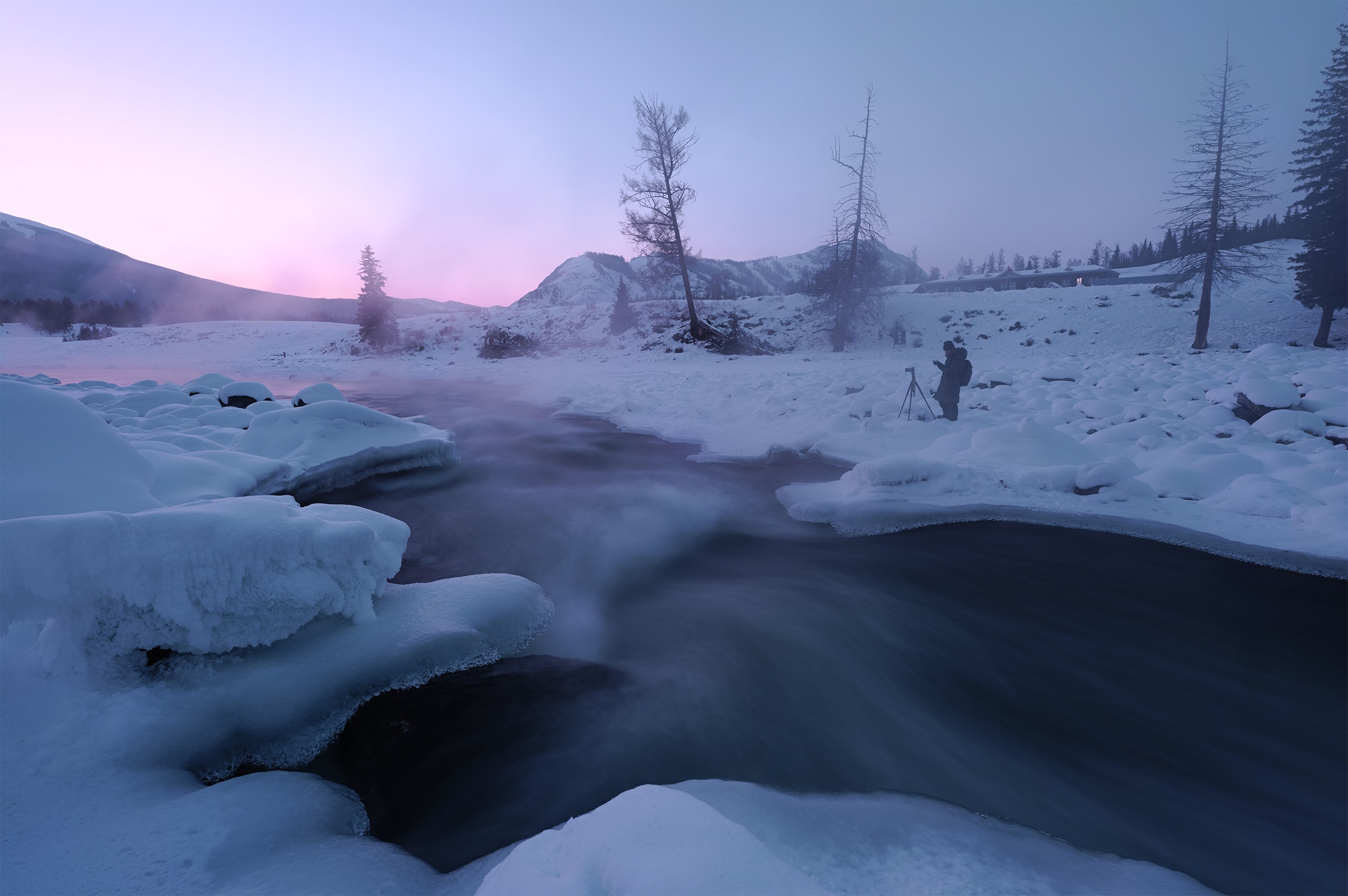 Diese Fotos wurden im Norden von Xinjiang, China, aufgenommen. Im Gegensatz zur üblichen Impression vom farbenfrohen Kanas-See und der autonomen kasachischen Präfektur Ili ist diese Region den ganzen Winter über mit Schnee bedeckt und die Temperaturen liegen normalerweise bei bis zu -40 Grad. Aufgrund dieser rauen Umgebung kommen Fotografen nur selten hierher . Dank dieses extremen Klimas und der spektakulären geomorphologischen Landschaft kann ich hier erfrischende Fotos machen. Das passt perfekt zu meiner Philosophie der Fotografie – der Suche nach der erhabenen Schönheit der Welt.